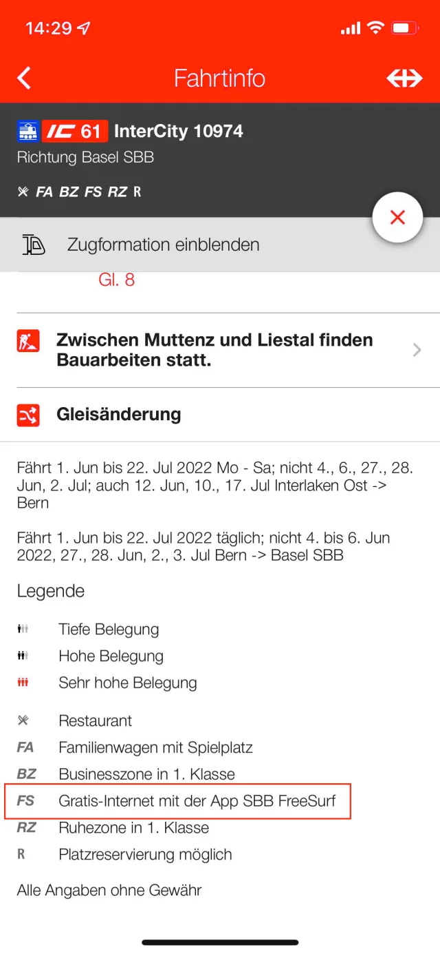 Im Fahrplan sind Verbindungen, in denen Gratisinternet angeboten wird, mit dem Symbol «FS» markiert, Bild 2. Wer das Gratisinternet im Zug nutzen will, muss zwingend ein iOS- oder Android-Gerät mit SIM-Karte bei sich haben. Das sind die Voraussetzungen: