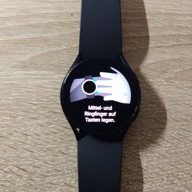 - Schauen Sie sich die Erklärungen an, wie gemessen wird. Letztlich schieben Sie die Uhr am linken Handgelenk etwas zurück und legen den Mittel- und Ringfinger auf die Tasten auf der rechten Uhrseite. Bewegen Sie die Finger während der Messung nicht. Bewegen Sie die Arme etwas vom Körper weg. Die Galaxy Watch wird sie auf dem Display informieren, was zu tun ist bzw. wenn z.B. die Berührung durch einen Finger etwas nachlässt.