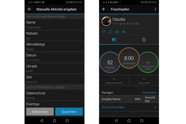 - Geben Sie der Aktivität einen Namen, beschreiben Sie den Aktivitätstyp (z.B. Cardio), die Dauer und wie das Training war und tippen dann auf Speichern.