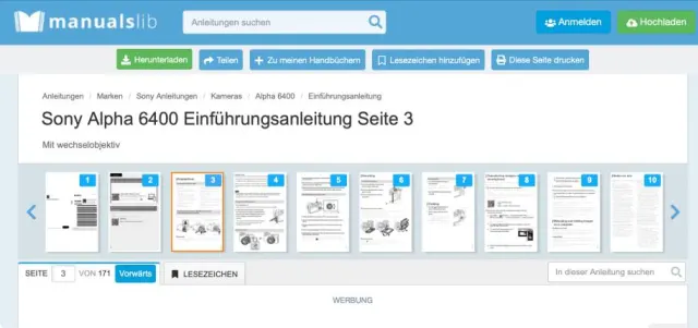 Bleiben wir bei den Suchmaschinen. Mit Suchanfragen wie sony a6400 anleitung stehen die Chancen recht gut, dass Sie schnell fündig werden. Dabei sollten Sie nach Möglichkeit immer die Webseite des Herstellers bevorzugen. Denn viele Handbuch-Websites sammeln Anleitungen und zeigen diese nur seitenweise, während die Besucher mit Werbung zugeschüttet werden, Bild 3.