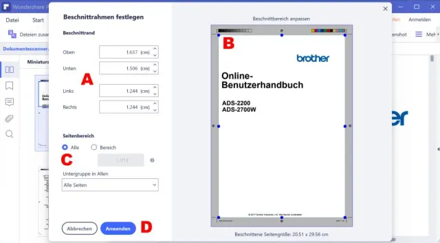 auf das Symbol Beschneiden D. Im folgenden Fenster könnten Sie das PDF präzise zuschneiden, Bild 9 A. Doch weil absolute Präzision in diesem Fall nicht gefragt ist, verwenden Sie stattdessen die Anfasser in der Voransicht B.