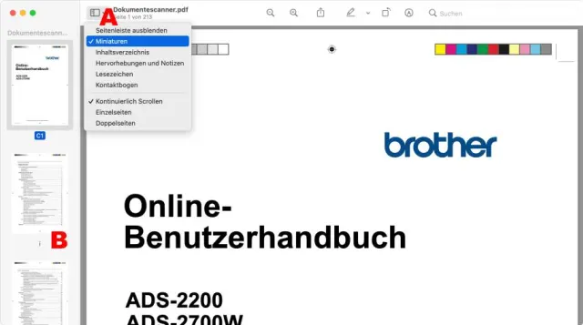 Seiten zu löschen, funktioniert sehr ähnlich wie in PDFelement. Öffnen Sie die Anleitung in «Vorschau». Klicken Sie oben links im Fenster auf das Einblendmenü und wählen Sie den Befehl Miniaturen, Bild 10 A, um die einzelnen Seiten im Briefmarkenformat zu sehen B.