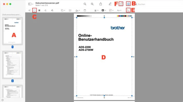 Quelle: PCtipp.chKlicken Sie auf die Stiftspitze B, um die Werkzeuge zur Bearbeitung einzublenden. Wählen Sie das Auswahlrechteck C und markieren Sie den Bereich der Seite innerhalb der Schnittmarken D. Mit einem Klick auf das Messer E wird das PDF zurechtgeschnitten. Dabei werden Sie von «Vorschau» gewarnt, dass dieser Beschnitt genau genommen nur die überstehenden Teile ausblendet, aber nicht wirklich abschneidet.