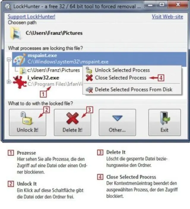 Hierzu erweitert das Programm das Kontextmenü von Windows um die Einträge What is locking this file? und What is locking this folder? Diese informieren den Nutzer bei der Auswahl darüber, welche Programme oder Dienste auf die jeweilige Datei beziehungsweise den jeweiligen Ordner zugreifen und eine Freigabe unterbinden. Per Rechtsklick und der Auswahl Close Selected Process lassen sich diese Programme schliessen. Ausserdem stehen in LockHunter auch die Funktionen Unlock it zum direkten Freischalten des Dateizugriffs und Delete it zum direkten Löschen zur Auswahl bereit.