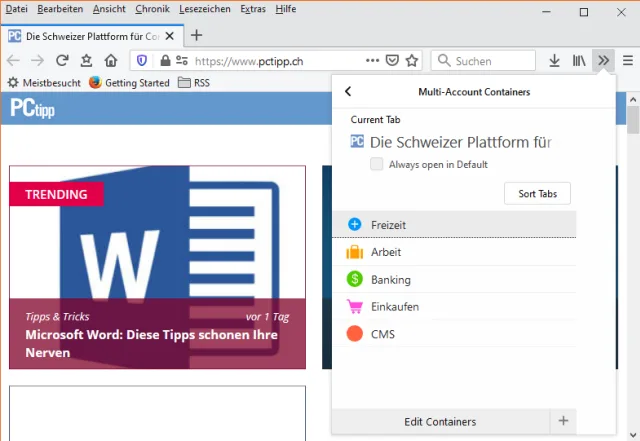Im Tab Privat können Sie sich jetzt beispielsweise auf eine Homepage mit Ihrem privaten Konto anmelden. Möchten Sie auf derselben Seite zeitgleich beispielsweise einen geschäftlichen Account nutzen, öffnen Sie einfach den Tab Arbeit und loggen Sie sich ein. Die bestehenden Tabs können Sie natürlich via Edit Containers anpassen und ausserdem neue, personalisierte Tabs anlegen.