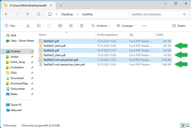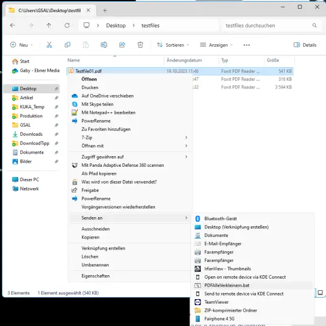 Wenn Sie jetzt eine PDF-Datei (oder gleich mehrere ausgewählte) mit rechts anklicken, finden Sie unter Senden an auch den Namen Ihres Scripts (PDFAlleVerkleinern.bat). Benutzen Sie dies, werden die markierten PDFs ins transport- und bildschirmfreundliche EBook-Format heruntergerechnet. Die Originaldateien bleiben bestehen, und es erscheinen zusätzliche, meist kleinere PDFs mit dem Namenszusatz «_klein.pdf». Wenn Sie mögen, können Sie im Script anstelle von «_klein» auch etwas anderes verwenden.