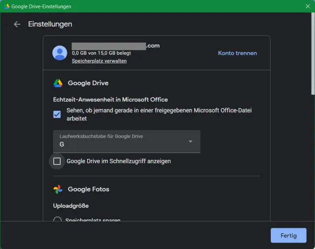 So gehts: Klicken Sie unten rechts im Infobereich mit der rechten Maustaste aufs Google-Drive-Symbol. Klicken Sie aufs Zahnrad-Symbol für Einstellungen und öffnen Sie darin erneut Einstellungen. Ein abermaliger Klick aufs Zahnrad-Symbol zeigt Ihnen etwa folgendes Bild. Hier ist inzwischen eine Option Google Drive im Schnellzugriff anzeigen hinzugekommen.