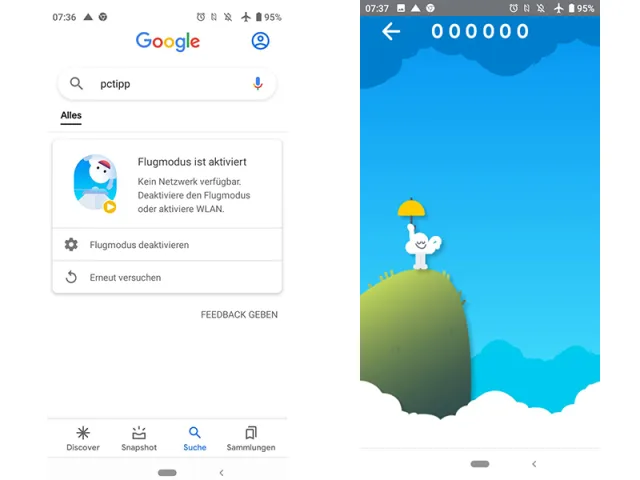 - Nun erscheint die Meldung «Flugmodus ist aktiviert». Das Spiel wird gestartet, indem Sie auf den animierten Bereich mit der fröhlichen Wolke tippen.