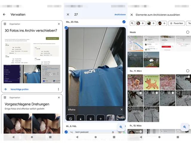 - Zusatztipp: Filteroptionen erhalten Sie, wenn Sie (vor dem Auswählen) auf das Bild-Icon mit dem Plus tippen. Sie können ebenfalls Elemente zum Archivieren auswählen, oben können Sie aber z. B. nach Favoriten oder von Google-Fotos erkannten Personen etc. filtern.