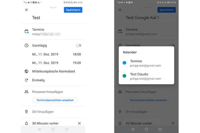 - Wenn Sie nun zwischen Titel und Zeitangabe auf die Info mit dem kleinen Kalender-Symbol tippen, öffnet sich ein weiteres Fenster, in dem Ihre Google-Kalender aufgelistet sind.