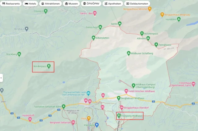 - Zoomen Sie auf der Karte in der gewünschten Region näher heran, bis Sie ein grün-weisses Symbol mit einem Wanderer sehen. Alternativ oder zusätzlich halten Sie nach gestrichelten Linien Ausschau, die Wanderwege kennzeichnen.