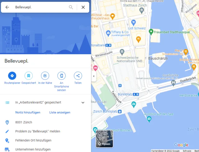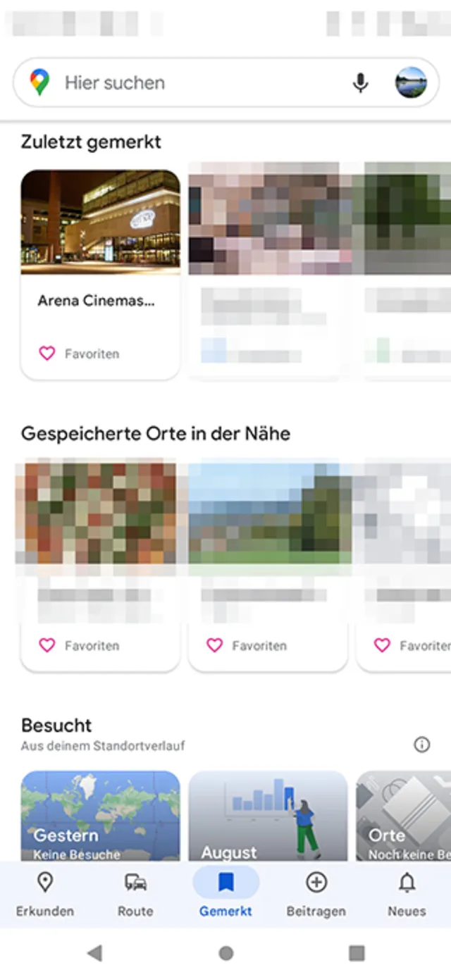 Wer diese Funktion nutzt, wird auch 2022 zuoberst Zuletzt gemerkt, dann Gespeicherte Orte in der Nähe, gefolgt von Besucht (falls Standortverlauf aktiviert) und darunter die Listen vorfinden (Stand: 10.08.22). Zu den Listen kommen wir später.