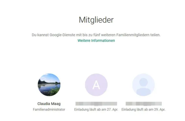 Sein Google-One-Konto kann man – ohne zusätzliche Kosten – zusammen mit bis zu fünf Familienmitgliedern nutzen. Die Familienmitglieder erhalten dadurch Zugang zum zusätzlichen Speicherplatz, aber keinen Zugriff auf die Dateien der anderen. Man kann Familienmitglieder in Google One jederzeit hinzufügen oder wieder entfernen.Hinweis: Ihre Dateien werden nicht für den Rest Ihrer Familie freigegeben und können nicht ohne Ihre Erlaubnis aufgerufen werden. Wenn Sie das möchten, müssen Sie z.B. in Google Fotos ein Album freigeben. Wie das geht, ist in diesem Tipp erklärt.