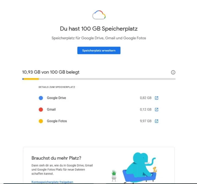 Wie viel Speicherplatz Ihrer z.B. 100 GB von Gmail, Google Drive oder Google Fotos belegt ist, sehen Sie unter Speicherplatz. Falls es eng werden sollte, können Sie via Kontospeicherplatz freigeben etwas aufräumen.