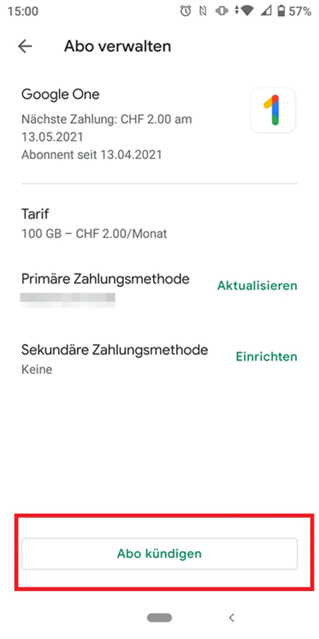 Nun wählen Sie das aktive Google-One-Abo aus und tippen auf Abo kündigen.