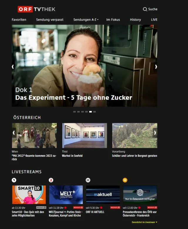 Quelle: Screenshot/PCtipp.chSendungen des Österreichischen Rundfunks ORF finden Sie über die Webseite oder via kostenloser App (Android, iOS). Bei der Desktop-Version sehen Sie oben: Favoriten, Sendung verpasst, Sendungen A-Z, Im Fokus, History und LIVE.