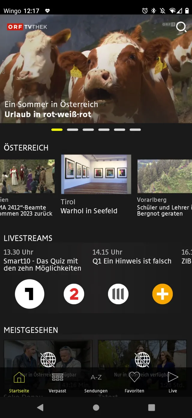 Quelle: Screenshot / PCtipp.chIn der App finden Sie die Tabs: Startseite, Verpasst, Sendungen A-Z, Favoriten und Live. In dieser App gibt es auch im Jahr 2022 keinen klassischen Kundenbereich (lediglich die Favoriten) und man braucht somit auch kein Login. Man sieht sofort, ob ein Inhalt in der Schweiz nicht abspielbar ist.