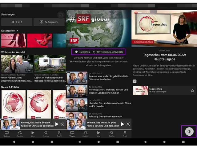 Live-TV: Fernsehen live geht ebenfalls (SRF 1, SRF zwei, SRF info). Tippen Sie in der App auf den Live-Tab.