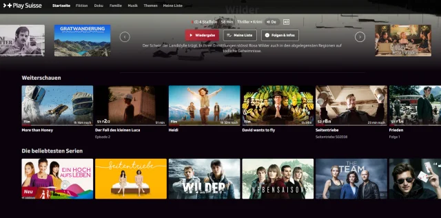 Play Suisse enthält Filme, Serien und Dokus aus der ganzen Schweiz, darunter bekannte Schweizer Serien wie «Wilder» und «Frieden» oder jüngere Produktionen wie «Tschugger» (Komödie), «Sacha» (Thriller) und eine neue Staffel für den Serienmörder «Arthur» (Thriller).