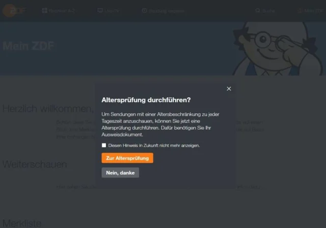 Quelle: ZDF Mediathek / ScreenshotSowohl auf der Webseite als auch in der App findet sich der Bereich Mein ZDF. Hierfür müssen Sie sich registrieren und anmelden. Sowohl via Desktop als auch via App werden Sie beim ersten Login gefragt, ob Sie eine Altersprüfung durchführen möchten. Dazu fragt ZDF nach einem Ausweisdokument. Natürlich können Sie dies mit Nein, danke ignorieren.