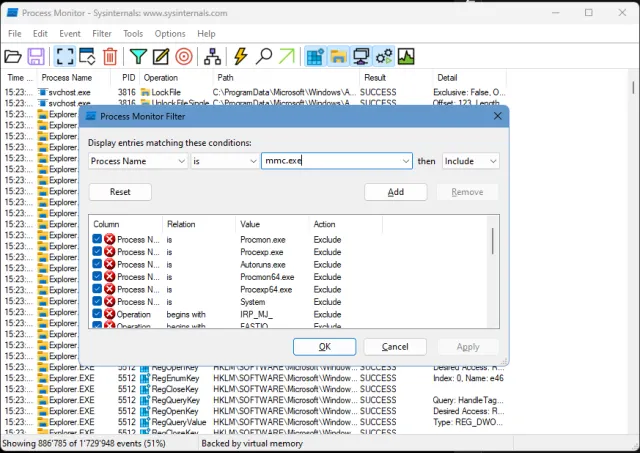 Es sind zwei Filter zu erstellen. Klicken Sie oben aufs Menü Filter und öffnen Sie Filter. Oben sind vier Ausklappmenüs. Im ersten wählen Sie Process Name. Den zweiten lassen Sie auf «is». Im dritten Feld tippen Sie mmc.exe ein. Gleich darunter klicken Sie auf Add.