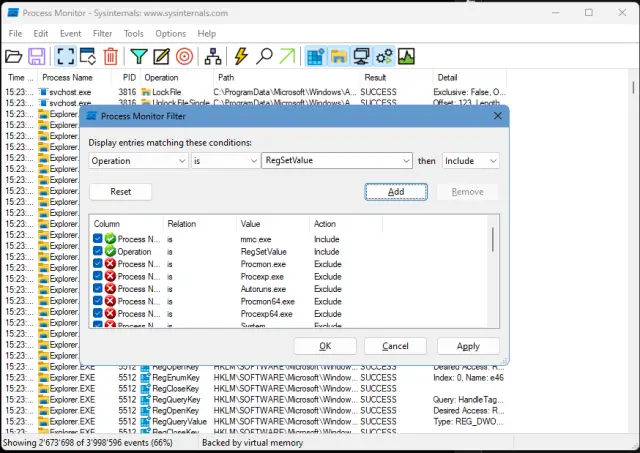 Quelle: PCtipp.chFür den zweiten Filter wählen Sie im ersten Ausklappmenü Operation. Das zweite lassen Sie wieder auf «is». Im dritten wählen Sie aus der langen Eintragsliste den Eintrag RegSetValue und klicken wieder auf Add.