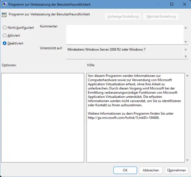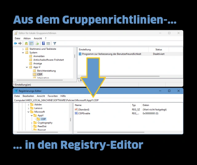 Wichtige Hinweise zum Schluss: Der CEIP-Eintrag (CEIPEnable = 0) war jetzt nur ein Beispiel einer Gruppenrichtlinie, die Sie auch per Registry-Editor festlegen könnten. Zum Rückgängigmachen öffnen Sie wieder den Gruppenrichtlinien-Editor und schalten unter Computerkonfiguration/Administrative Vorlagen/System/App-V/CEIP den Eintrag Programm zur Verbesserung der Benutzerfreundlichkeit nach einem Doppelklick wieder auf Nicht konfiguriert und klicken auf OK.