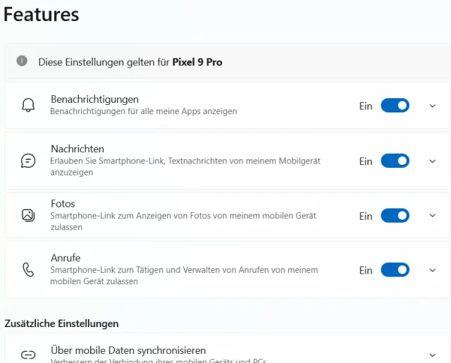 Nicht jeder möchte alle Funktionen von Smartphone-Link nutzen – etwa aus Datenschutzgründen oder weil ein Feature schlicht nicht gebraucht wird, Bild 6. Das lässt sich ganz einfach einstellen: Öffnen Sie die Smartphone-Link-Anwendung unter Windows. Klicken Sie oben rechts auf das Zahnrad-Symbol. Unter Features lassen sich einzelne Funktionen wie Benachrichtigungen, Nachrichten, Fotos, App-Nutzung oder der Dateizugriff separat aktivieren oder deaktivieren. Auch der Speicherort für empfangene Dateien lässt sich hier anpassen. Diese Einstellungen sind besonders hilfreich, wenn Sie zum Beispiel keine privaten SMS am Arbeitscomputer sehen möchten oder den Fototransfer auf den PC deaktivieren wollen.
