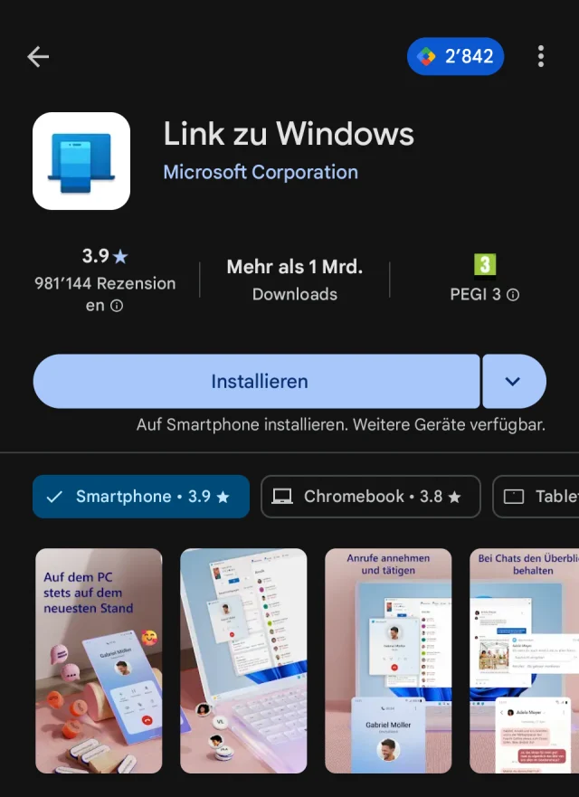 Quelle: PCtipp.chInstallieren Sie auf Ihrem Smartphone die App Link zu Windows aus dem Google Play Store, Bild 1. Öffnen Sie am PC das Programm Smartphone-Link. Bei Windows 11 ist dieses meist vorinstalliert, Bild 2, ansonsten können Sie es via Einstellungen auf Ihrem PC installieren. Suchen Sie dort nach Smartphone-Link und aktivieren Sie den Eintrag.