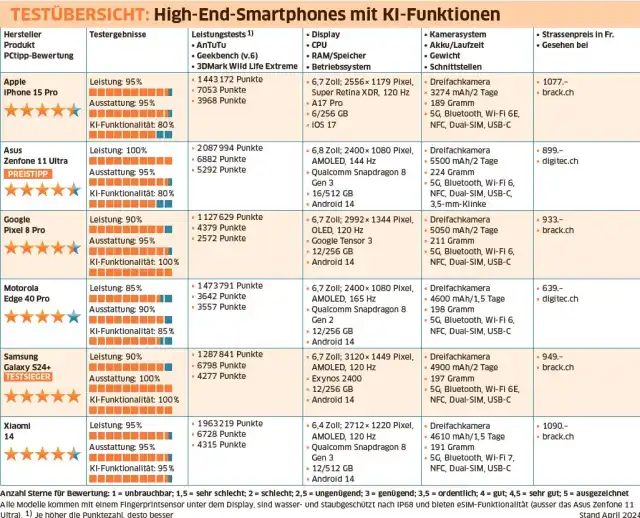 Wers günstiger mag: Unser Preistipp, das Asus Zenfone 11 Ultra, punktet zwar vor allem bei dem Tempo, KI-seitig bietet es aber vor allem aufgrund des «Super-KI»-Chips Snapdragon 8 Gen 3 von Qualcomm noch eine Menge Zukunftspotenzial.