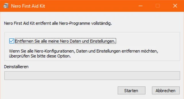 Im Nero First Aid Kit angekommen, aktivieren Sie Entfernen Sie alle meine Nero Daten und Einstellungen, anschliessend klicken Sie auf Starten, um die Nero-Einträge zu entfernen.