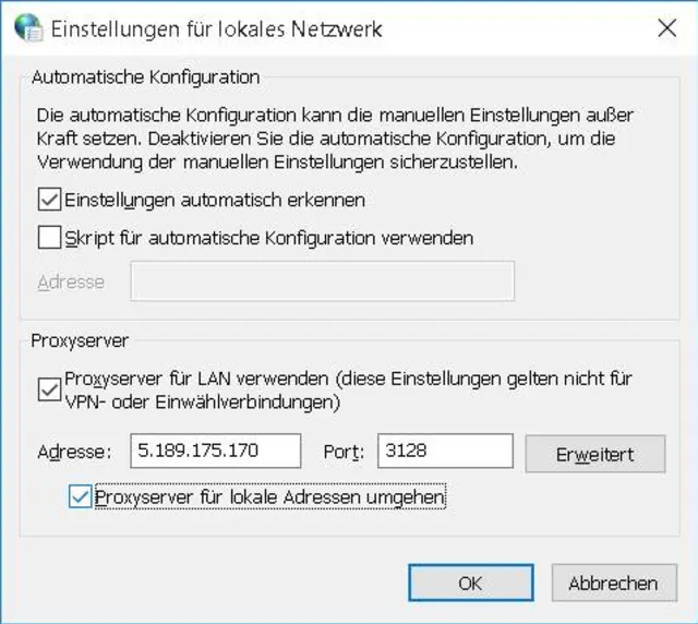 Das ginge so: Öffnen Sie die Systemsteuerung und darin die Internetoptionen. Unter Verbindungen öffnen Sie LAN-Einstellungen und aktivieren einen Proxyserver, zum Beispiel 5.189.175.170 mit Port 3128. Die Option «Proxyserver für lokale Adressen umgehen» sollten Sie eher aktivieren.