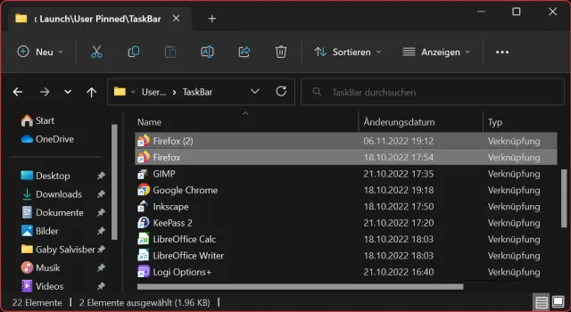 - Hier sind einige Verknüpfungen zu sehen, jene der betroffenen Anwendung kommt unter Umständen mehrmals vor. Löschen Sie vom betroffenen Programm am besten alle Verknüpfungen, die Sie im TaskBar-Ordner antreffen.