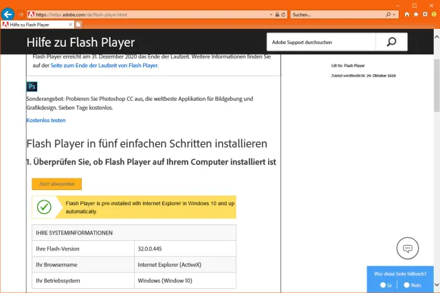 Microsoft Internet Explorer: Wenn Sie die Prüfung unter https://helpx.adobe.com/de/flash-player.htm im Internet Explorer unter Windows 10 durchführen, dürfte sich folgendes Bild zeigen.