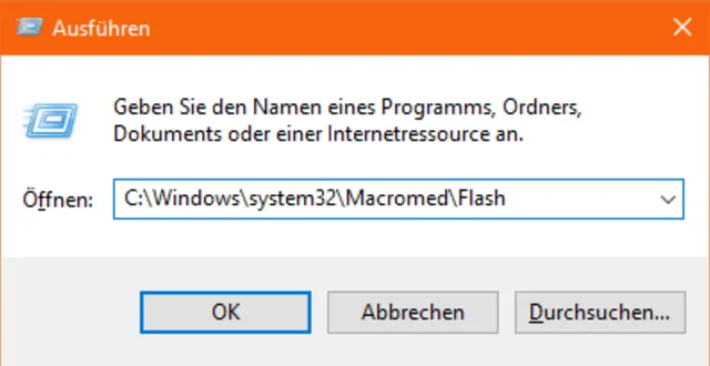 Nach der eigentlichen Deinstallation drücken Sie Windowstaste+R zum Öffnen des Ausführen-Fensters und tippen Folgendes (ohne Leerzeichen) ein: C:\Windows\system32\Macromed\Flash, gefolgt von der Enter-Taste.