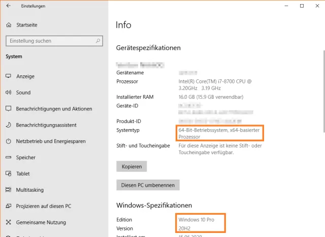 Es muss ein Update für Windows 10 sein, für die korrekte Architektur (32bit/x86 oder 64bit/x64) und für die korrekte Unterversion (z.B für 1709, 1803, 1809, 1903, 1909 oder 2004 und neuer). Um herauszufinden, welche Windows-10-Version Sie haben, klicken Sie im Datei-Explorer mit der rechten Maustaste auf Dieser PC und öffnen Sie die Eigenschaften. Hier entdecken Sie hinter «Systemtyp» zum Beispiel 64-Bit-Betriebssystem. Weiter unten bei den «Windows-Spezifikationen» finden Sie die Version, hier zum Beispiel 20H2, was für das zweite Halbjahr 2020 steht. Für 2004 (20H1) und 20H2 verwenden Sie die Version für 2004. Auf der Catalog-Seite steht bei diesem Download auch deutlich «Windows 10, version 2004 and later».