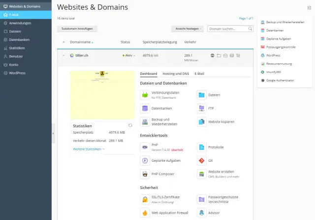 Das Control Panel ist eine grafische Nutzeroberfläche, mit der Sie Zugriff auf alle Einstellungen für die Webseite haben, unter anderem auf E-Mail, Sicherheitszertifikate und Datenbanken, Bild 1.