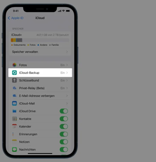 Für iPhones und iPads ist iCloud+ sogar unverzichtbar, wenn die Daten geschützt werden sollen – denn Backups sind hier nicht so leicht anzufertigen. Allein die kostbaren Fotos rechtfertigen den Aufstieg zu iCloud+. Öffnen Sie auf jedem iPhone und iPad die Einstellungen und tippen Sie ganz oben auf die Apple-ID. Wechseln Sie in den Bereich iCloud und markieren Sie die Option iCloud-Backup: