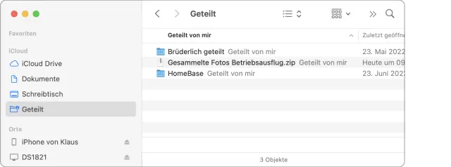 Dabei verlieren Sie nie die Kontrolle über die freigegebenen Objekte. Klicken Sie in der Seitenleiste eines Finder-Fensters auf den Bereich Geteilt, um alle freigegebenen Objekte aufzulisten – ganz egal, wie tief sie in einer Ordnerhierarchie verbuddelt sind.