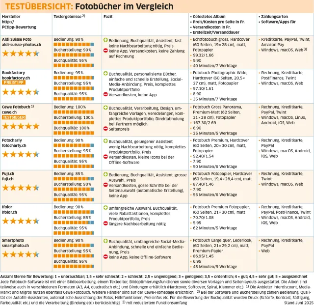 Die Garde der Schweizer Fotobuchanbieter beeindruckt auf der ganzen Linie: Dank ihrer grossen Erfahrung, reifen Software und cleveren Editier- respektive Korrekturmöglichkeiten lassen sich gute bis erstklassige Fotobücher erstellen. Mithilfe der Assistenten geht das Ganze richtig schnell von der Hand. Der Test beweist, dass sich Fotoalben mit allen sieben getesteten Anbietern in weniger als einer Stunde fertigstellen und an den Hersteller übermitteln lassen. Zwei Anbieter ragen besonders heraus: Cewe Fotobuch, der Testsieger, und unser Preistipp Bookfactory, der zudem auch mit exklusiven Einbänden glänzt. Cewe Fotobuch überzeugte uns einmal mehr mit seiner Software, Qualität und Verarbeitung. Anwender bekommen hier rundum ein erstklassiges Gesamtpaket ohne Schwächen.