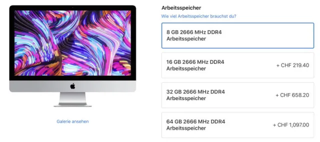 Wenn Sie heute einen iMac mit 27 Zoll kaufen, wird das Gerät standardmässig mit 8 GB RAM geliefert. macOS geht mit Ressourcen zwar sehr sorgsam um, aber 8 GB reichen in der heutigen Zeit einfach nicht mehr. Wer jedoch bei der Konfiguration im Apple Store ein Upgrade anwählt, muss vermutlich leer schlucken: