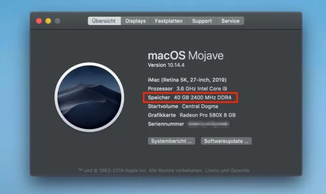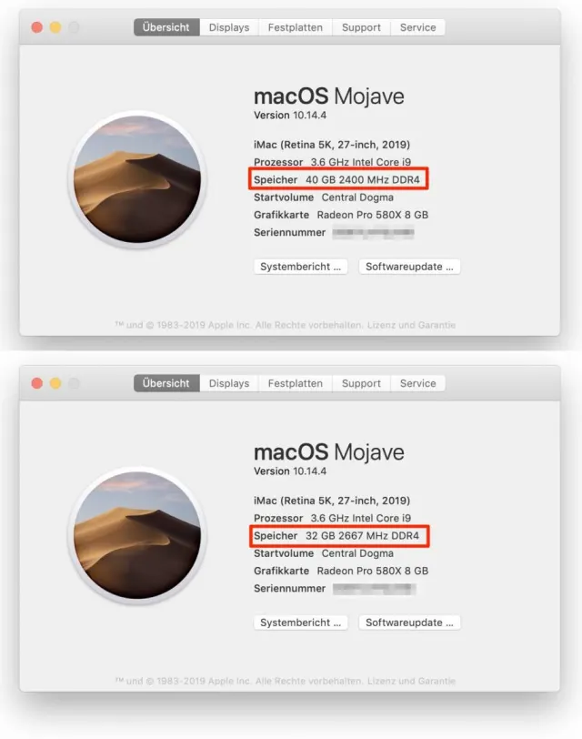 Allerdings gibt es noch ein Detail zu klären. Werden RAM-Riegel mit 2667 MHz in verschiedenen Grössen gemischt, reduziert macOS den Takt auf 2400 MHz. Das sieht im Dialogfeld «Über diesen Mac» dann so aus: