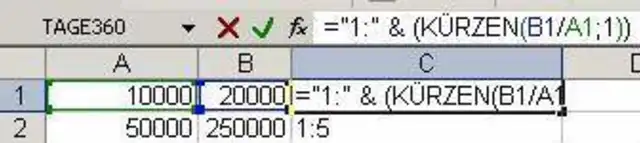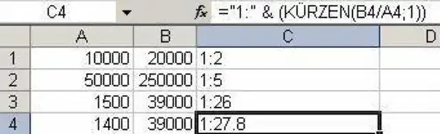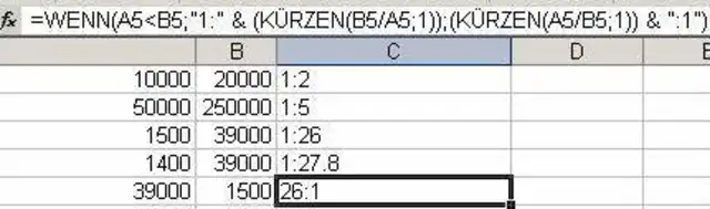 Ich möchte in Excel die Zahlen aus zwei Spalten in einer dritten als Verhältnis zueinander darstellen (z.B. 1:2 oder 1:26 etc.). Kann dies über eine Formel erfolgen?