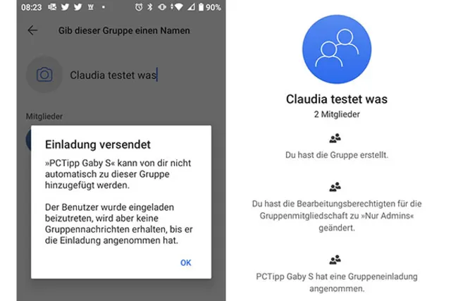 Sie können zwar Gruppen erstellen, aber in Signal Teilnehmende nicht automatisch zu einer Gruppe hinzufügen. Mögliche Gruppenteilnehmende erhalten jeweils eine Einladung. Als wir dies ausprobierten, erhielt Kollegin Salvisberg innerhalb der Signal-App eine «Unterhaltungsanfrage» für die von mir erstellte Gruppe.