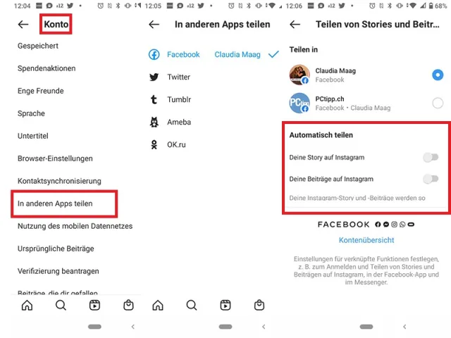 - Unter Automatisch teilen sind vermutlich zwei Schieberegler aktiviert (blau). Deaktivieren Sie diese bei Deine Story auf Instagram sowie Deine Beiträge auf Instagram.