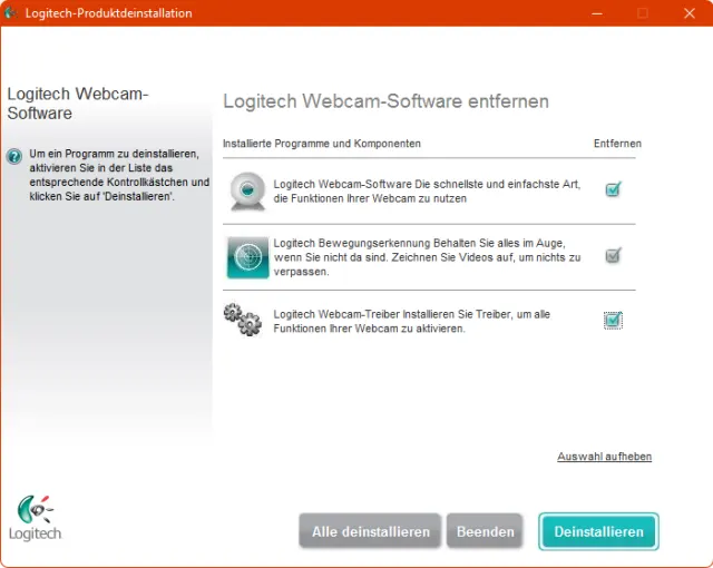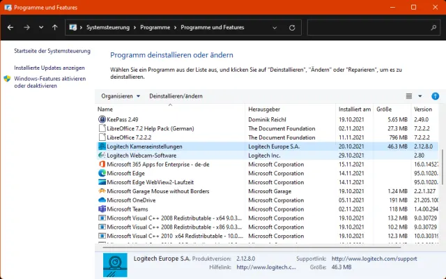 Einige Webcams haben noch Software mitgebracht. Ich empfehle, sämtliche mit der alten Cam installierten Programme zu deinstallieren und den PC neu zu starten. Darum ab in die Systemsteuerung, zu Programme/Programm deinstallieren. Hier fündig geworden, deinstallieren wir die Logitech Kameraeinstellungen sowie die Logitech Webcam-Software.