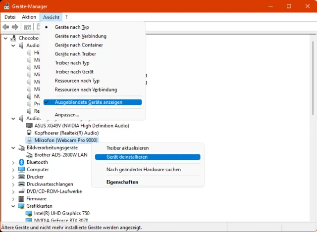 Geräte-Manager checken: Vermutlich ist Folgendes nicht nötig, aber das Entfernen alter Treiber schadet meist nichts. Klicken Sie mit rechts auf den Startmenü-Knopf und öffnen Sie den Geräte-Manager. Via Ansicht haken Sie Ausgeblendete Geräte an. Klappen Sie die Zweige auf und prüfen Sie, ob bei irgendwelchen Audio- oder Bildbearbeitungsgeräten noch Teile Ihrer Kamera erscheinen. Hier zum Beispiel ist der Treiber des in der alten Webcam enthaltenen Mikrofons noch zu sehen. Mit Rechtsklick darauf und Deinstallieren wird man ihn los.