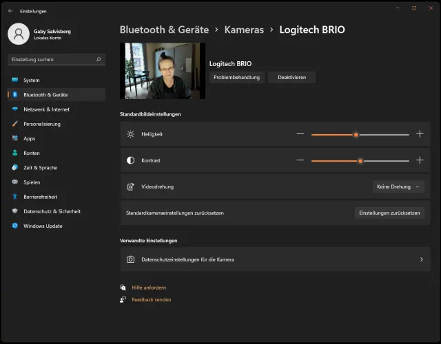 Öffnen Sie Start/Einstellungen/Bluetooth & Geräte/Kameras. Hier taucht das neue Gerät unter «Verbundene Kameras» auf, in unserem Fall heisst es Logitech BRIO. Klicken Sie drauf – und nun bitte lächeln! Sie können hier die Helligkeit und den Kontrast beeinflussen oder das Videobild auf den Kopf stellen.
