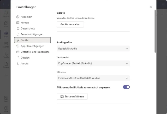 Die meisten Videokonferenz-Apps bieten Einstellungs- und Testmöglichkeiten. Nutzen Sie diese.Wir zeigen es am Beispiel von Microsoft Teams. Öffnen Sie darin oben via Drei-Punkte-Symbol die Einstellungen. Klicken Sie auf Geräte. Wählen Sie bei Lautsprecher Ihren Kopfhörer oder Ihr Headset aus. Bei Mikrofon empfiehlt es sich, zu jenem des Headsets zu greifen, sofern Sie eines benutzen.