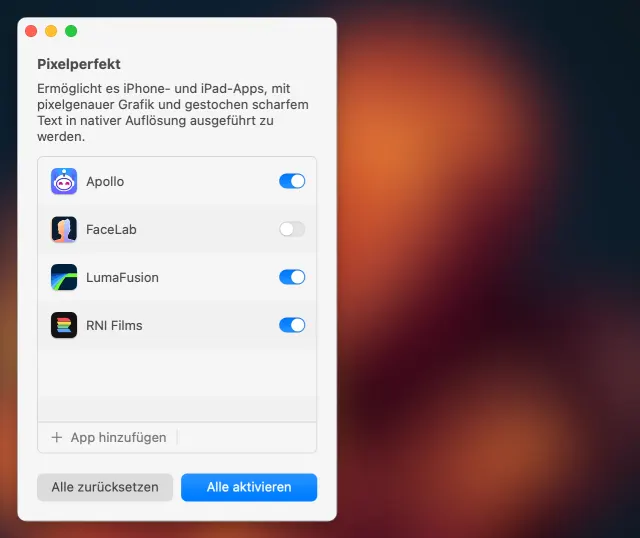 Wenn eine App am Mac läuft, wird die Darstellung automatisch auf 77 Prozent der eigentlichen Grösse skaliert. Deshalb wirkt die Darstellung oft zu klein und teilweise sogar unscharf. Dagegen hilft die kostenlose Mac-Anwendung Pixelperfekt, die von Github geladen wird. Die Anwendung heisst genau genommen «Pixelperfekt (mit Rechtsklick öffnen)»: Da die Anwendung von Apple nicht notarisiert, also geprüft wurde, muss sie beim ersten Mal mit der rechten Maustaste angeklickt und im Kontextmenü der Befehl Öffnen verwendet werden, damit Sie die Warnung von macOS abnicken können.Schon bei den ersten Versuchen entpuppt sich die Anwendung als Kleinod, auf das Sie nicht mehr verzichten werden. Wählen Sie aus der Liste der installierten Apps einfach jene aus, die Pixelperfekt für eine optimale Darstellung aufpolieren soll – und nach einem Neustart der App ist sie kaum wiederzuerkennen.